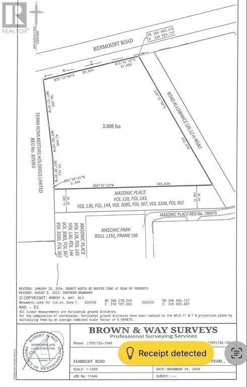 6.44 ACRES on a high visibility area of Kenmount Road in Mount Pearl, with 417’ of road frontage on Kenmount Road. Located on the Northern Municipal boundary of Mount Pearl, in the area between Brant Drive and Mount Carson Avenue, backing on Masonic Place. The front 5.49 acres are Zoned Residential Commercial Mix (RCM) while 0.95 acres at the rear is Zoned Residential High Density (RHD). Many land use possibilities fall into the zoning of RCM, permits and approvals from City of Mount Pearl will be the responsibility of the purchaser. Any applicable HST is the responsibility of the purchaser. There is a 20.12 meter width road allowance held by the provincial government on the east boundary but not located within the boundaries of the 6.44 acres. (id:12973)